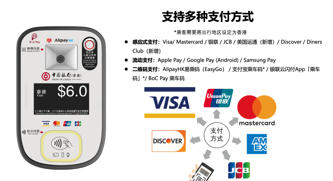 香港中银公司联合杭州国朗科技有限公司、上海讯联数据有限公司,为香港九巴龙运巴士实现American Express/Discover/Diners Club新支付方式在香港近5000辆公交场景落地使用。
