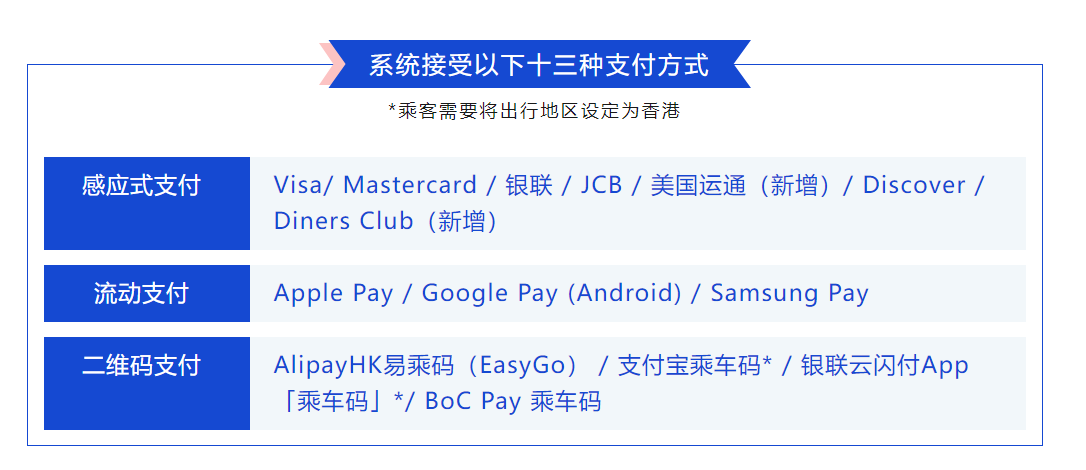 九巴龙运支付方式支持感应式支付、流动支付、二维码支付。新增的支付方式属于世界通行的信用卡,使用者遍布全球,相信能为商务旅客提供更多选择。