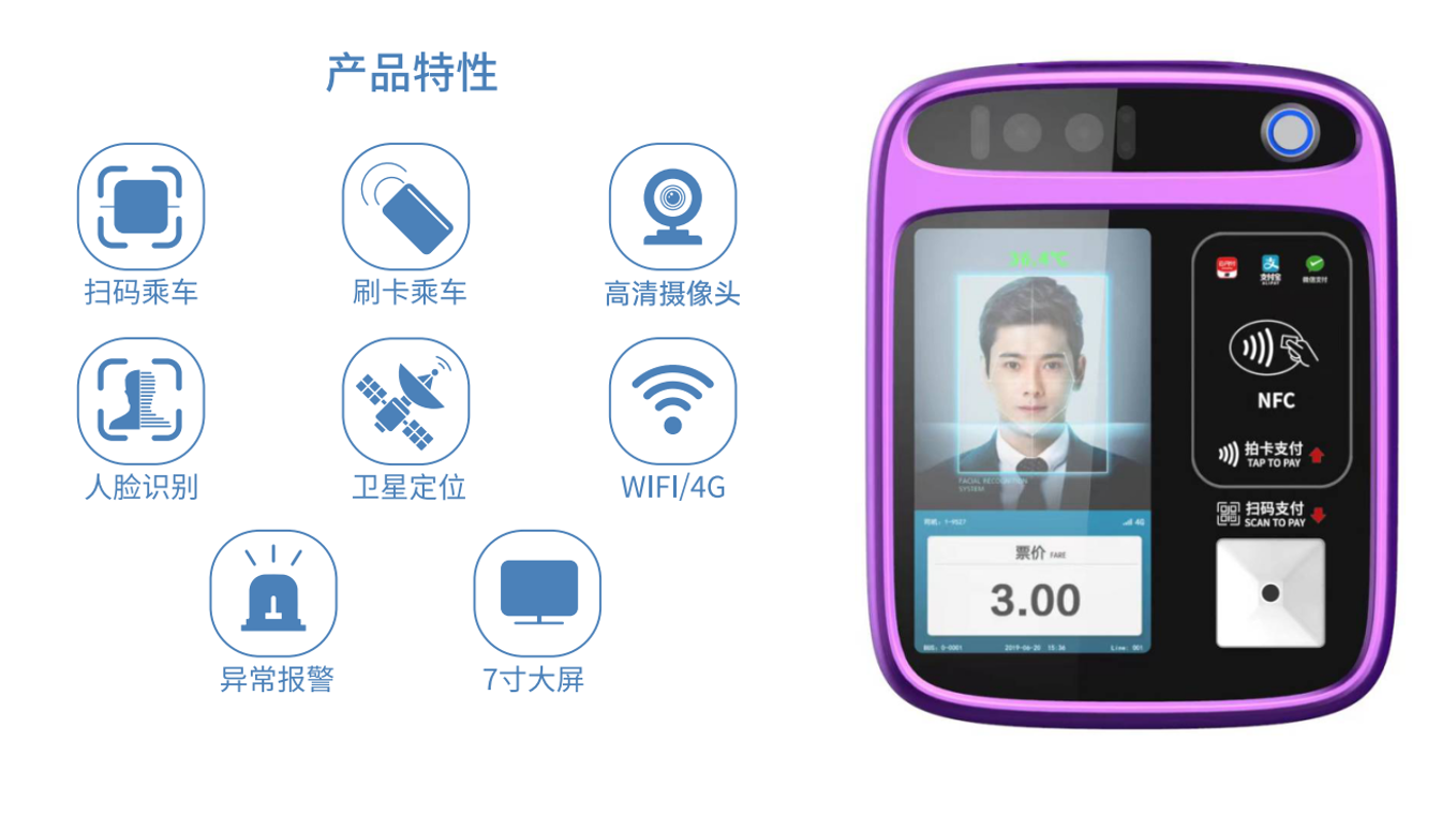 紫色款款公交人脸识别一体机+测温+身份证,集人脸识别和NFC、扫码功能于一体,提供安全可靠的支付环境。同时兼具其他类支付公交、定制巴士、企业、校园、食堂等。