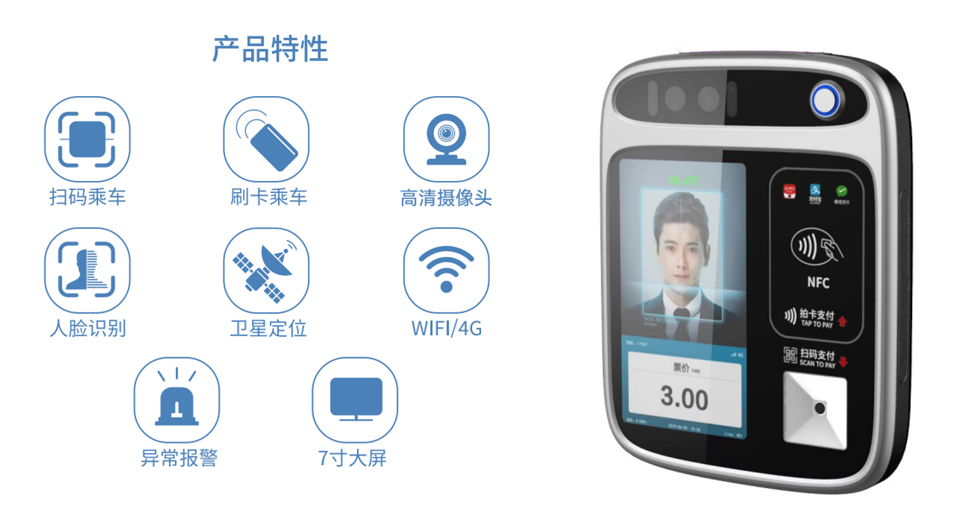 公交人脸识别支付POS机是杭州国朗科技有限公司基于公交业务场景,定制开发一款集移动支付、人脸识别、身份证识别的一款车载智能终端设备,支付方式多样,同时适用定制巴士、企业、校园、食堂等场景人脸支付